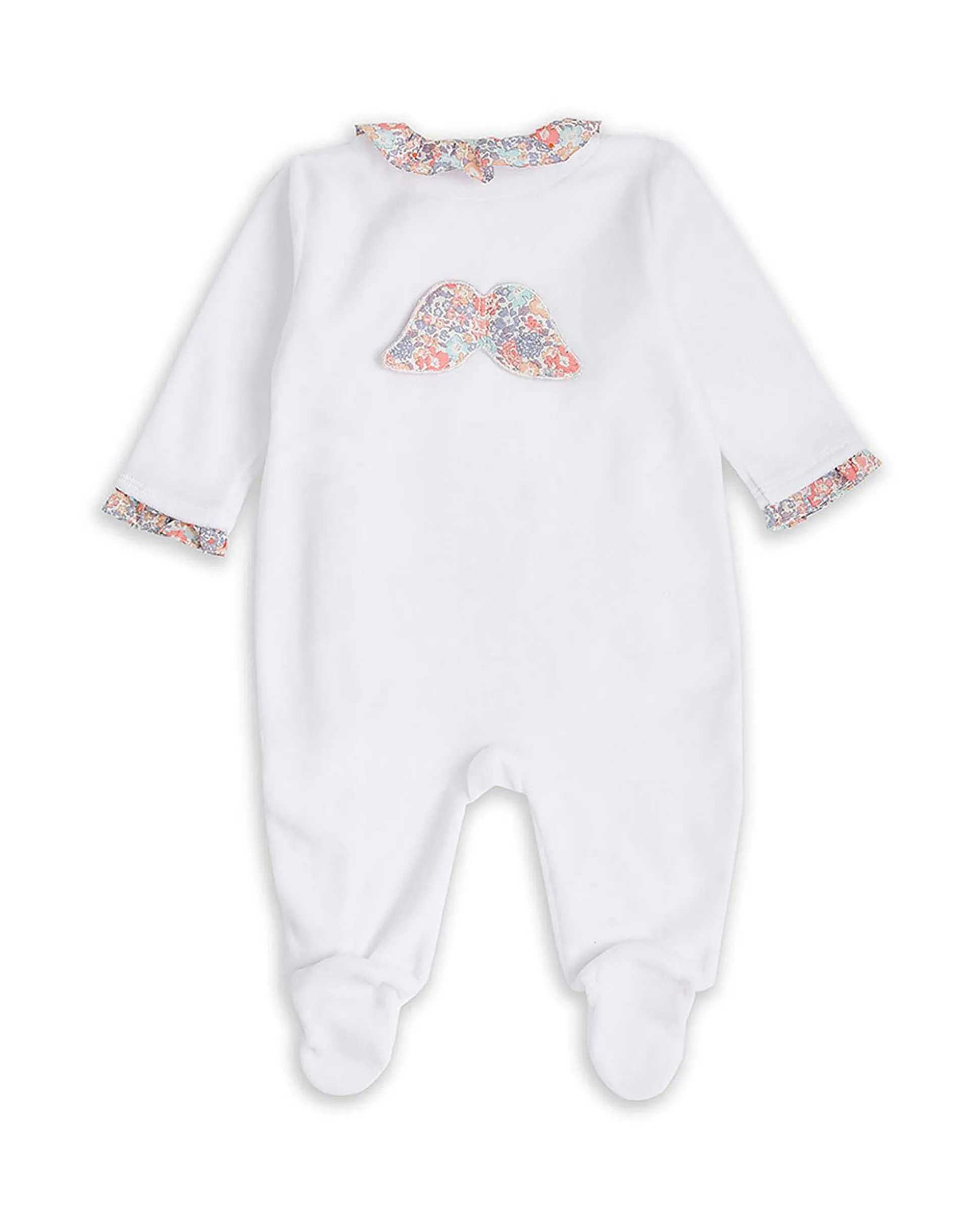 Our Iconic Velour Angel Wing™ Sleepsuit With A Pretty Floral Liberty Print ™, Ruffle Collar, And Frilled Cuffs.