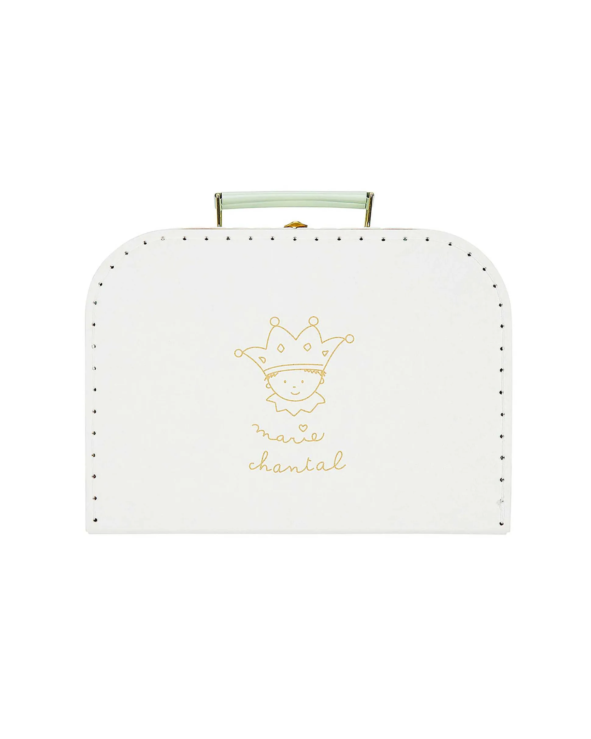 Our Charming Small Marie-Chantal Suitcase Is Made From Paper And Is Edge Stitched In Cream. Featuring A Soft Green Handle And Brass Fittings, With Our Tino Logo Printed On The Front, It Makes A Fun And Charming Gift Or Useful Storage For Your Little One. From Toiletries To Packed Lunches And A Weekend Away, It Will Always Find A Home.