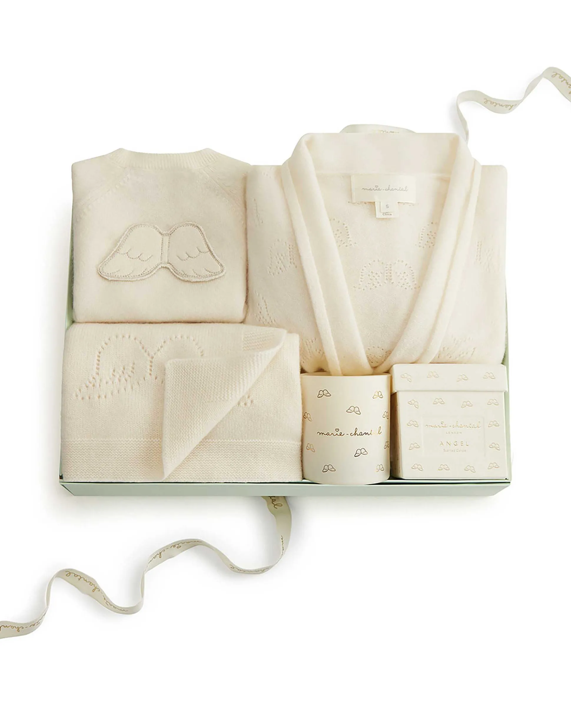 Curated By Mc And The Most Perfect Of Gifts – This Cashmere Gift Set Features Our Latest Addition To The Angel Wing Collection – Marie-Chantal Angel Candle, Alongside Our Cashmere Angel Wing Robe And Matching Blanket, And Ariel Cashmere Romper. The Perfect Gift For Those Special Ones.
